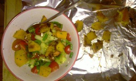Lunch - salad - consisted of roasted pumpkin thrown in with other salad material - tomatoes and cucumber etc.